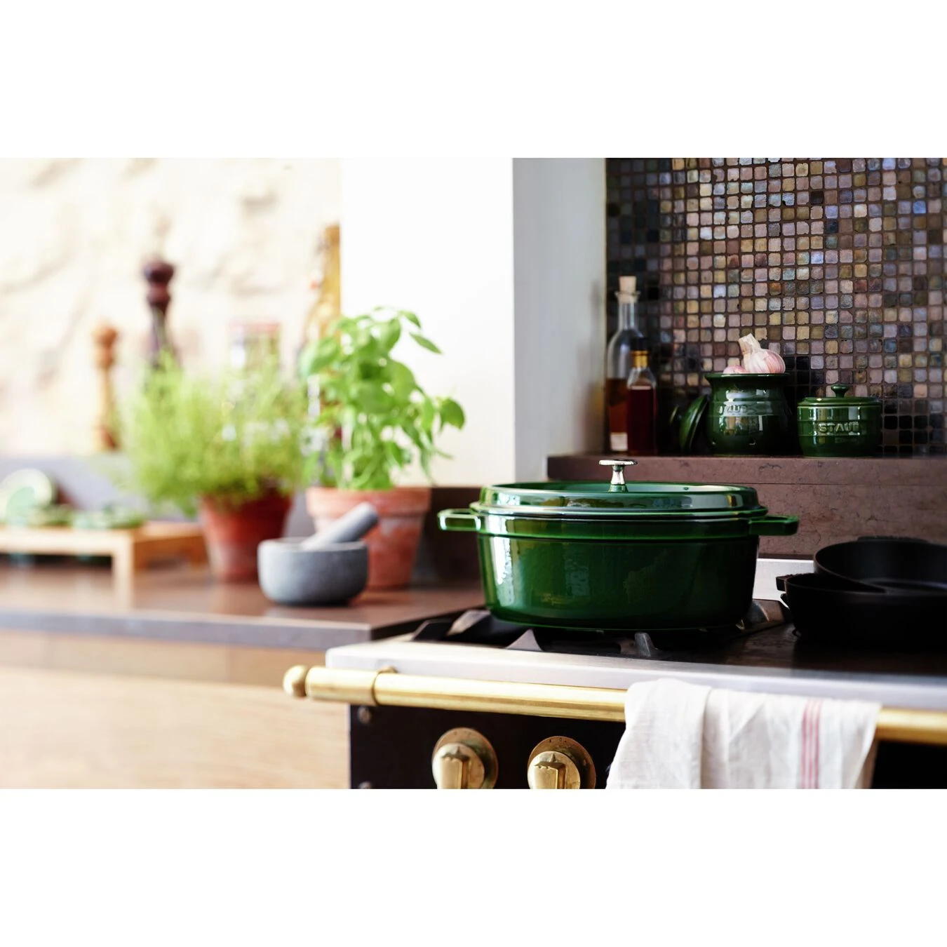 Cette cocotte ovale en fonte Ă©maillĂ©e STAUB Basilic de 33 cm est idĂ©ale pour 7 personnes, pour prĂ©parer des plats mijotĂ©s, des rĂŽtis, de la volaille et mĂȘme du pain ! Compatible tous feux et four, elle peut Ă©galement sâutiliser sur induction. La couleur basilic de l’Ă©mail est obtenue avec la finition spĂ©ciale « Majolique », une technique particuliĂšre appliquĂ©e Ă lâĂ©mail permet dâobtenir une brillance unique et une teinte dâune profonde intensitĂ©. VĂ©ritable savoir-faire authentique de crĂ©ation française, cette cocotte est une piĂšce unique, issue dâun processus de fabrication traditionnel. Avec son design Ă©laborĂ© et son poids optimisĂ©, son couvercle plat au contour marquĂ© prĂ©sente dâexcellentes propriĂ©tĂ©s de rĂ©tention de lâhumiditĂ© et assure grĂące Ă ses picotsÂź, un arrosage homogĂšne, une pluie dâarĂŽmes, pour des plats qui mijotent longtemps. LâintĂ©rieur de cette cocotte est Ă©maillĂ© noir mat, la marque de fabrique STAUB. Cet Ă©mail de qualitĂ© supĂ©rieure permet dâobtenir une meilleure rĂ©sistance aux rayures et facilite lâentretien. Il possĂšde les propriĂ©tĂ©s idĂ©ales pour saisir, rĂŽtir et caramĂ©liser les aliments. NĂ©e en Alsace, la cocotte STAUB a su traverser le temps et les frontiĂšres. PrĂ©fĂ©rĂ©e aussi bien par les amateurs que les grands chefs, elle passe aisĂ©ment de la cuisine Ă la table. Quel que soit le plat que vous concoctez, avec la Cocotte STAUB vous avez lâassurance de conserver toute lâintensitĂ© et les saveurs. La viande restera tendre et les lĂ©gumes moelleux. Cette cocotte est composĂ©e de fonte, un alliage de fer riche en carbone, un des matĂ©riaux qui retiennent le mieux la chaleur, la diffuse lentement et la redistribue de maniĂšre parfaitement homogĂšne. Une fois la fonte suffisamment chaude, ses propriĂ©tĂ©s de rĂ©tention de la chaleur permettent de rĂ©duire le feu au minimum, afin de laisser mijoter doucement les plats. La fonte conserve Ă©galement le froid : la cocotte Ă tempĂ©rature ambiante peut ĂȘtre placĂ©e au rĂ©frigĂ©rateur avant de servir afin de rester froide une fois Ă table.