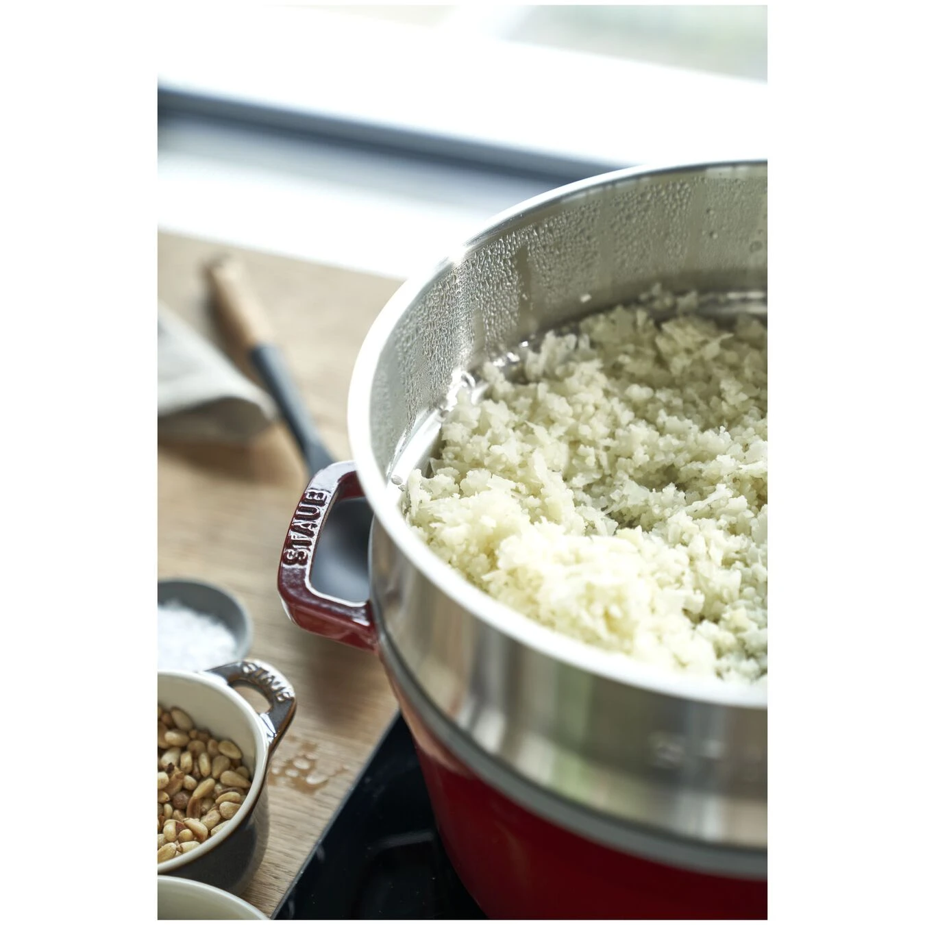 - Idéale pour préparer deux plats en un, comme du riz dans le fond de la cocotte et du poisson dans le panier vapeur.